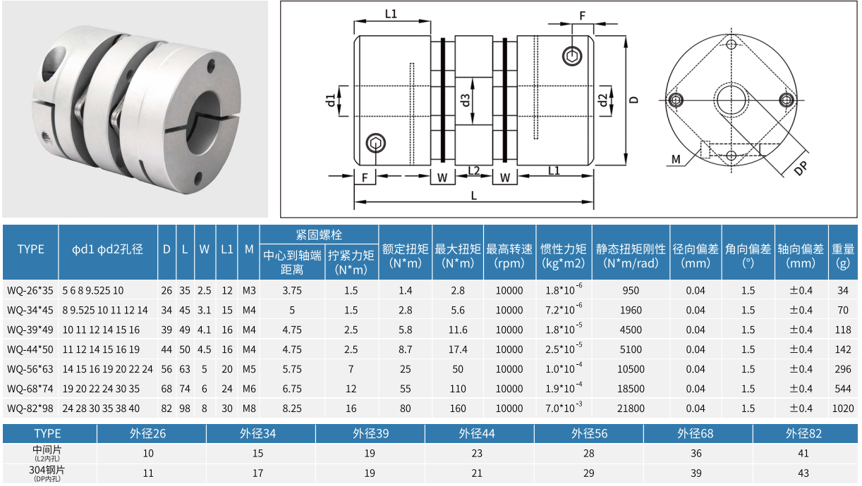 WQ系列弹性联轴器,采用沉头螺栓拧紧的力量来使狭缝收缩,而将轴心紧紧夹持住。